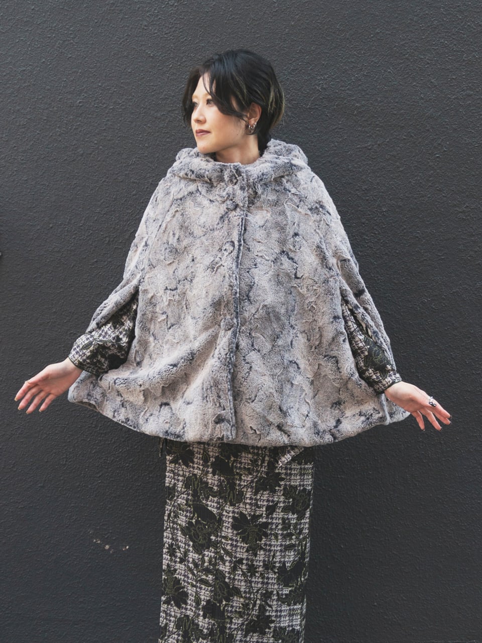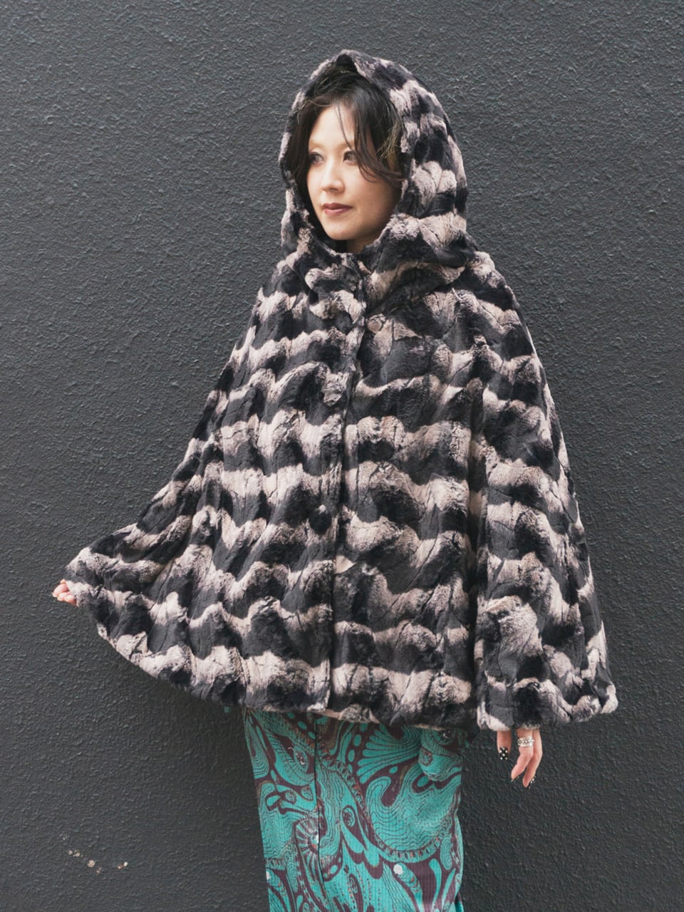 髪の毛を結ってもすっぽりかぶれる大きなフードが特徴のマントコート。